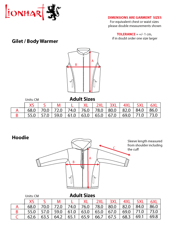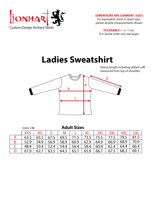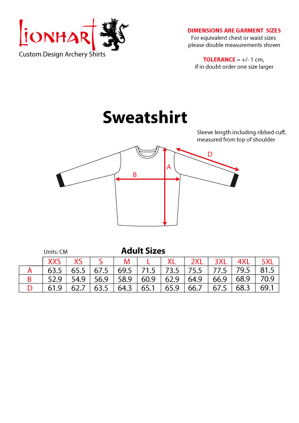 Hoodies are not designed for shooting in, but offer an additional outer layer to help keep warm when collecting arrows etc. The hoodies are made from a thinner outer printed layer with a V Mesh lining with a zipped front. Kangaroo pockets are also available if preferred. Winter hoodies are also available with a heavy fleece lining for cooler conditions, however the cost of these is higher. They also have a much lower degree of lateral stretch, and by default have a zipped front. We recommend wearing these looser than the shirts, usually allowing around 5–10cm extra room compared to the shirts. For example: an XL shirt (chest measurement B = 57.5cm) would work well with XL–3XL sized hoodie (chest measurement B = 63–67cm).